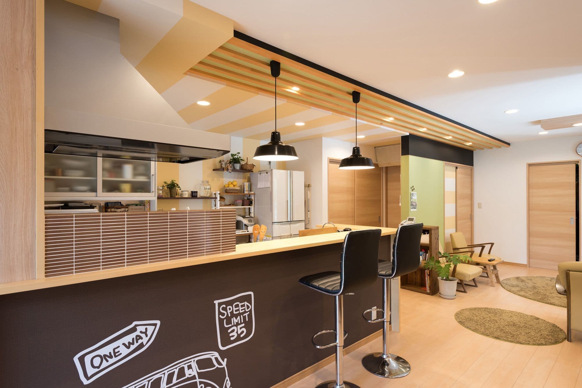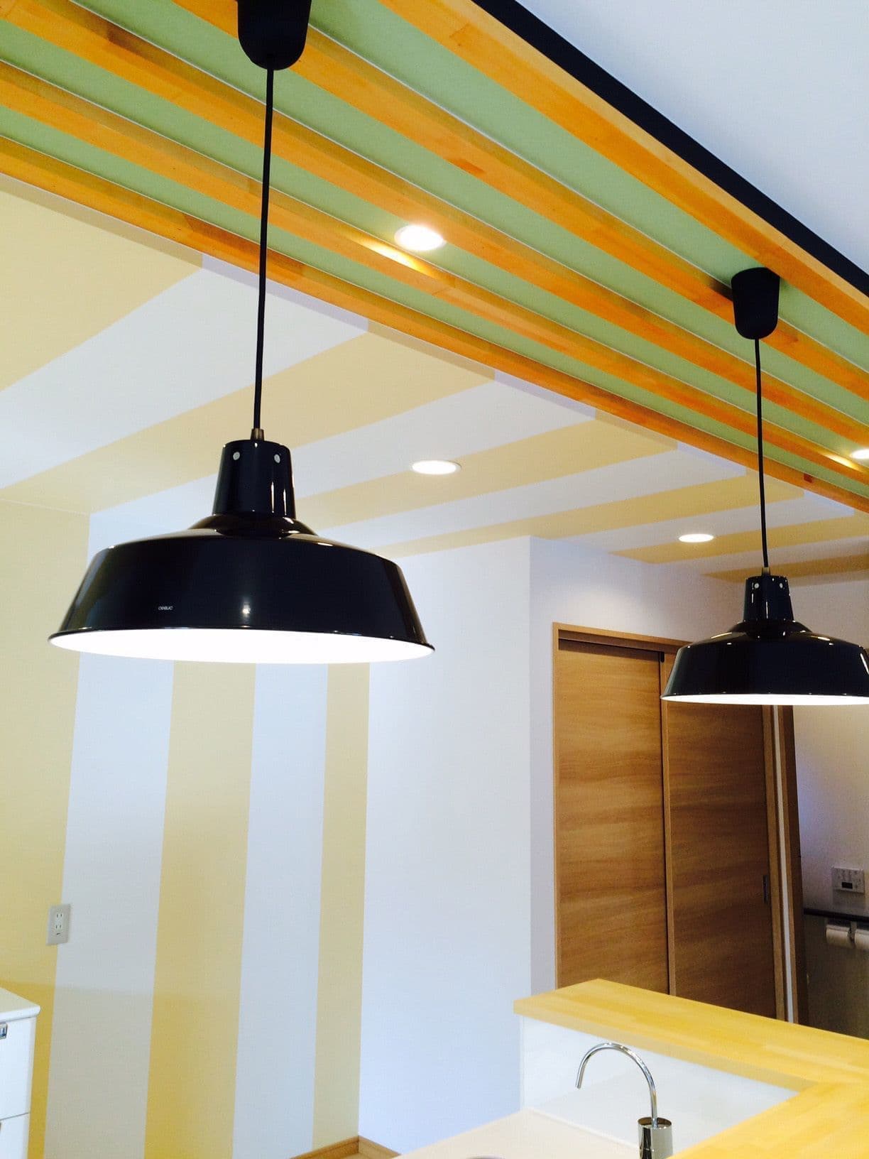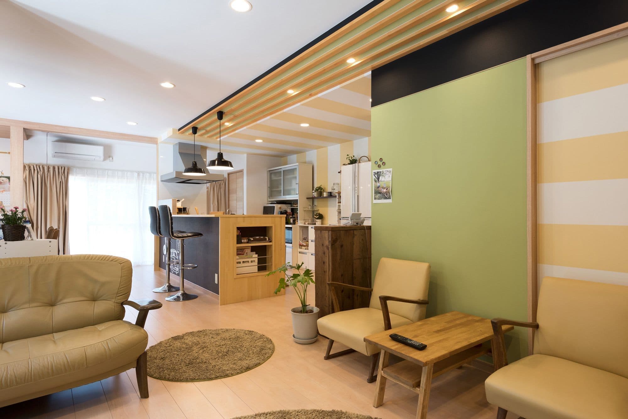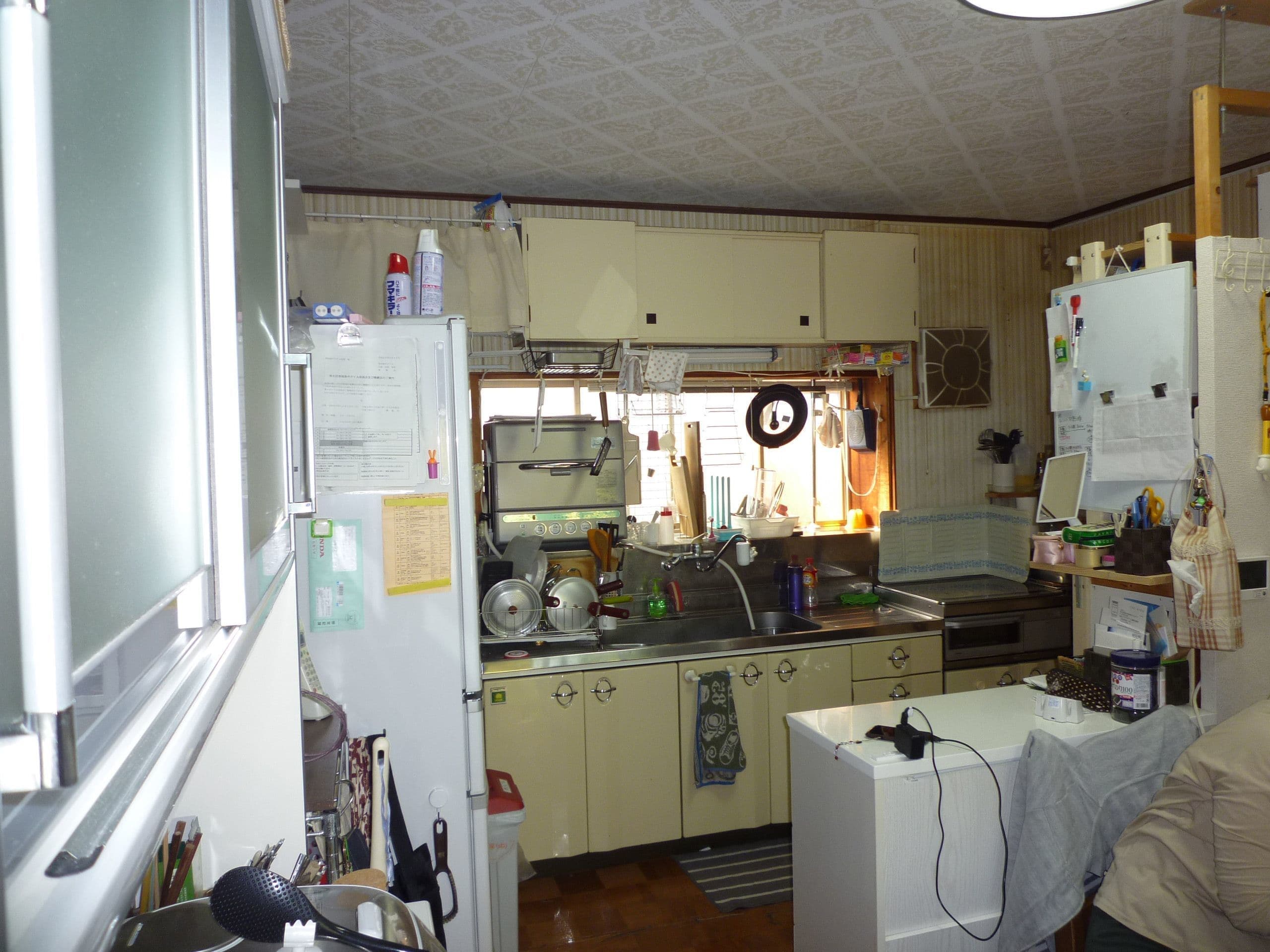 「ストライプやミントグリーンの壁が若々しく、見るからに楽しそうなキッチン空間である。全体のプランもつかいやすくなっているのがよくわかる。このリフォームで次男が料理の道に進みたいと決心するとは・・・業者冥利に尽きるのではないか。」