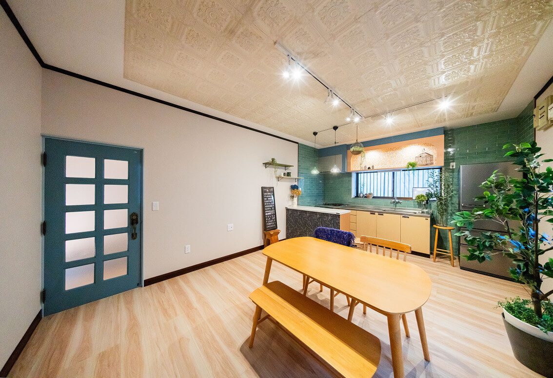 そんなお施主様のご要望を叶える為にキッチンとフローリングは残してタイルと壁紙とペイントの魔法で
