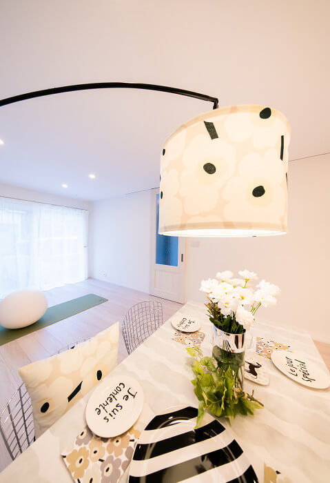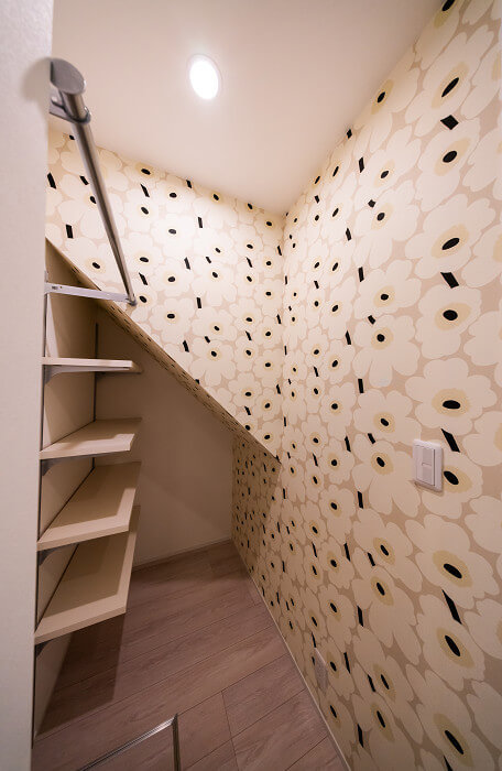 🤍マリメッコの柄をパントリーや階段下収納に取り入れ、遊び心をプラス。フロアライトもマリメッコ柄でリメイク。