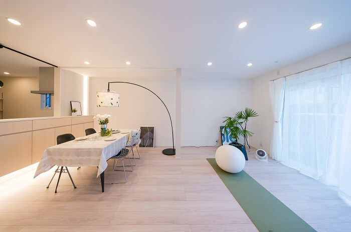 1階はワンルームの考え方を取り入れ、和室・洋間・台所をひとつのLDKに。