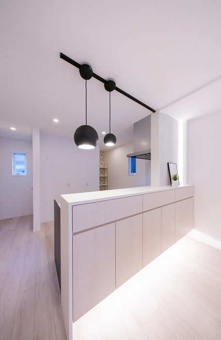 🤍キッチンカウンターを境にモノトーンを楽しめる空間に。