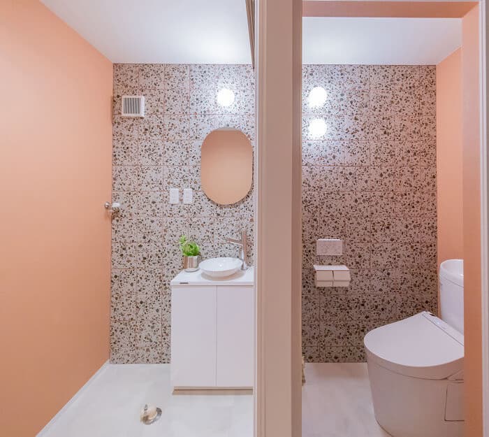 タカラスタンダードグランスパのテラコッタ柄 を基調に、水まわり全体を統一感のあるデザインでコーディネート。