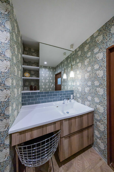 ✨2階のバスルームを撤去し、洗面空間を拡張。エリーナの片寄ボウルプラン を採用し、メイクもできるパウダールームに。