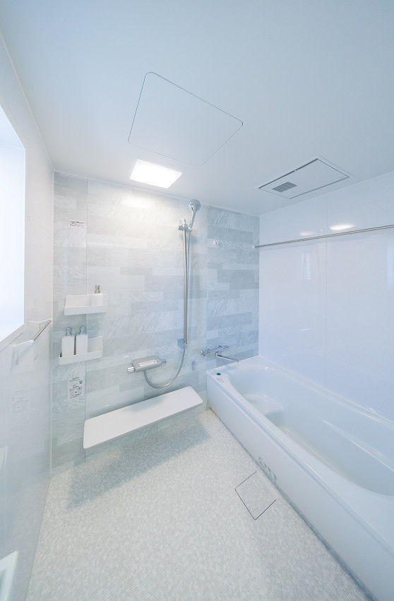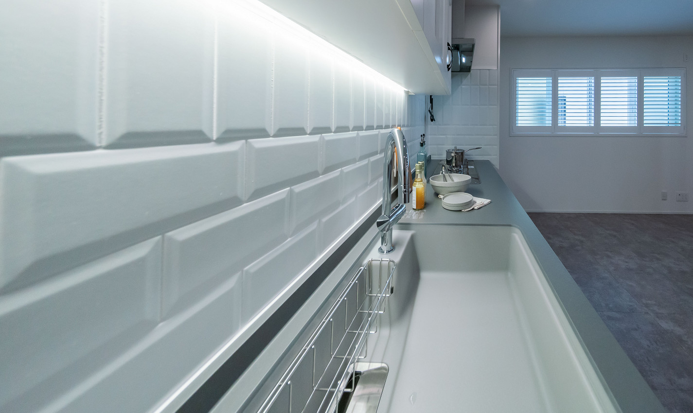 タイルのさりげない面状が、光と陰影にやさしい表情を添えてくれます。貼り方にも工夫を凝らし、タイルの魅力が映えるよう間接照明を仕込み、