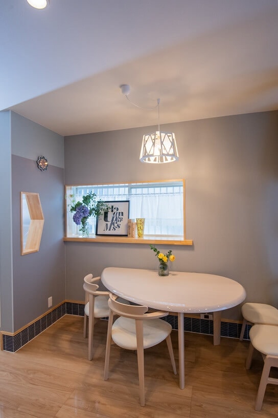 階段を回り階段とし浴室、脱衣室を1坪サイズに、元々和室だったスペースにキッチンと奥様の小部屋を配置。リビングの一角にワンちゃんコーナーを設けて床全体にコーティングをしました。和室の小上がりの高さで鮮やかなブルーのタイルをリビング全体に張りアクセントとしています。またリビングの壁にトルコの鍋敷きを照明に改造して取付。奥様といつもネイルを見せ合いっこしていたのですが、そのネイルからのインスピレーションでレースのドアをオリジナルで作りました♪