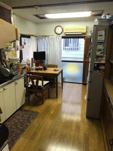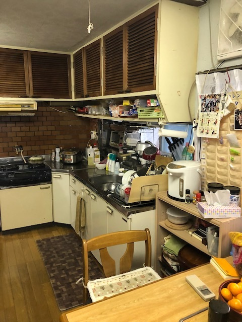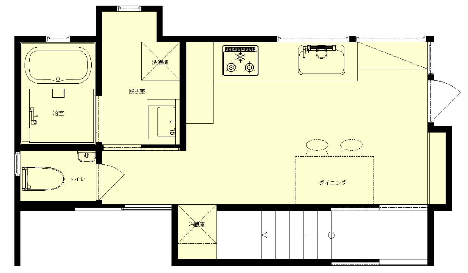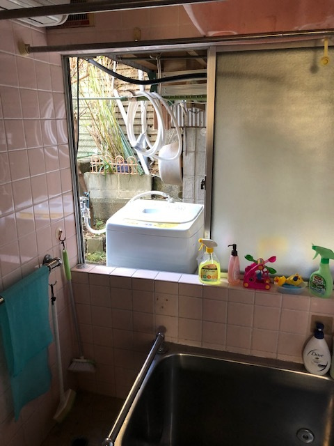 細長いスペースにキッチン、浴室、トイレと、リフォーム前は脱衣室がなく「あれ、洗濯機はどこですか?」と聞くと