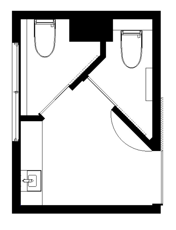 個々のトイレ、手洗いスペースを広く取りたかったので、トイレスペースを斜めに間仕切りました。