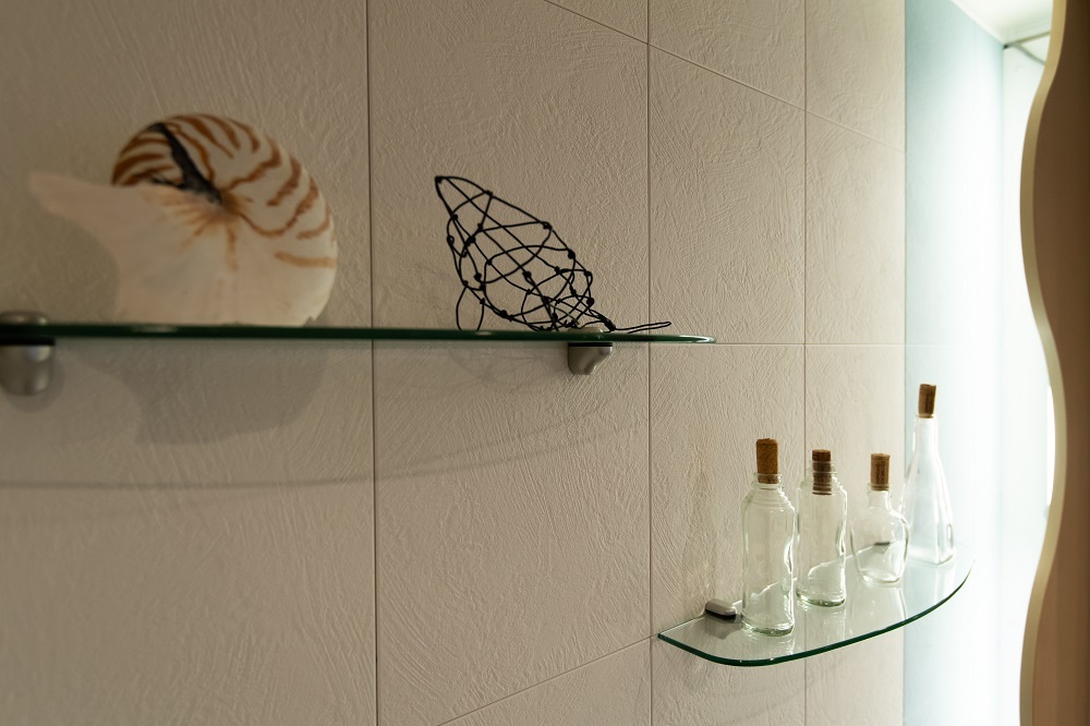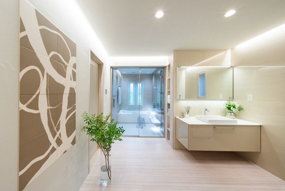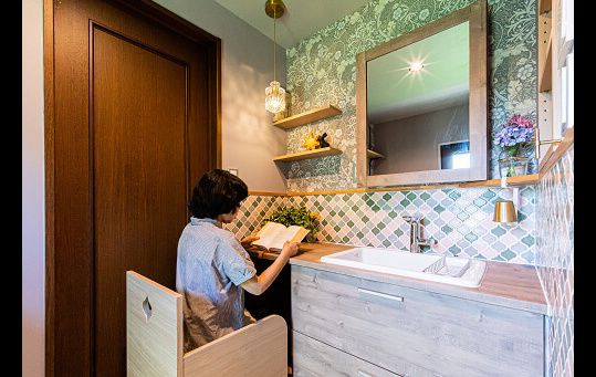 奥様談「私の第二のバスライフがはじまる。」「洗面室に飾った調湿効果のあるタイルも凄くアクセントになって素敵!」