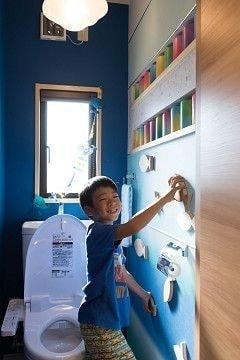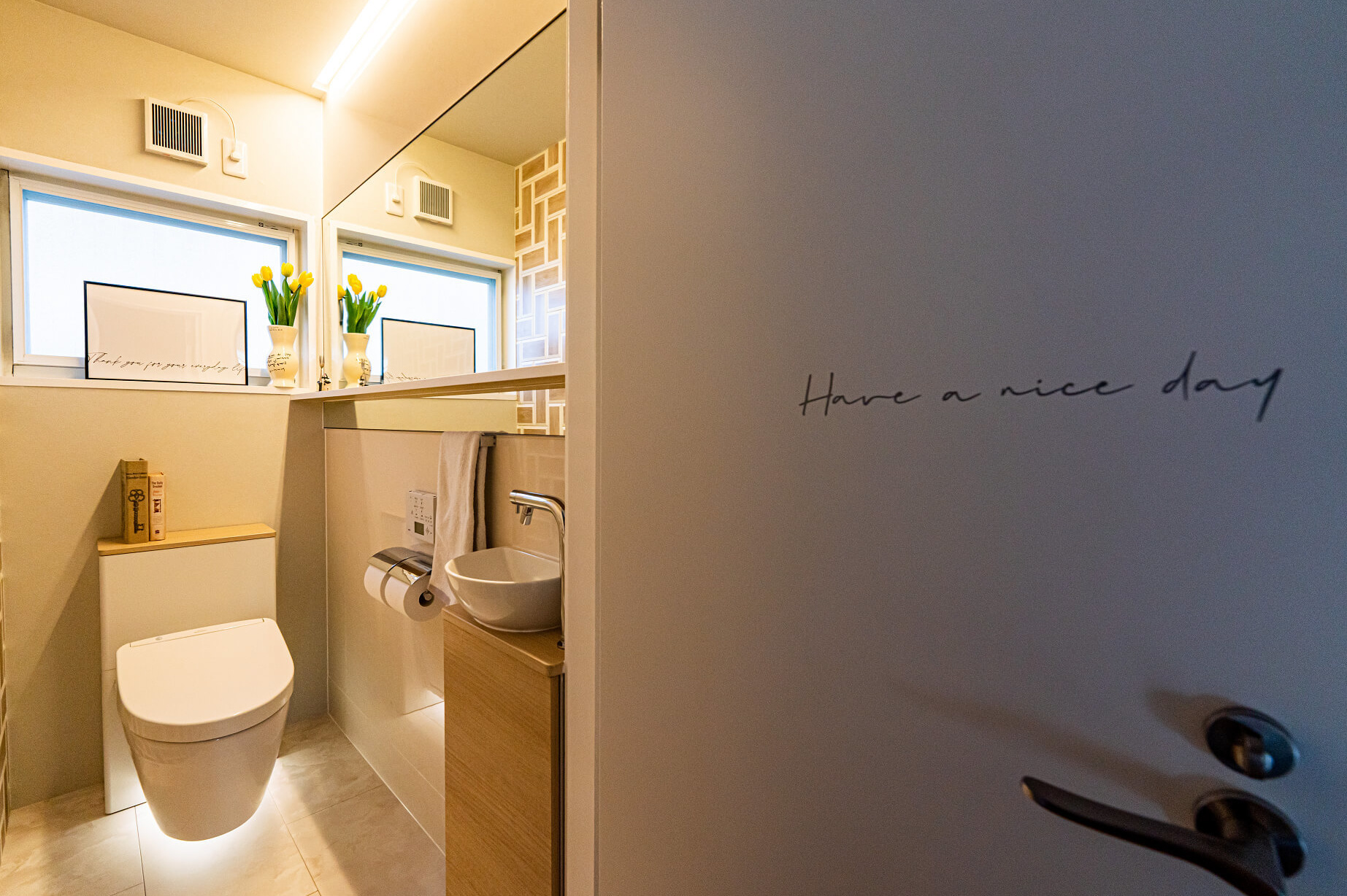 仕上がりをとても喜んでくださり、隣に住むお母さんは用事がないけど、トイレのドアを毎回開けて「あ~やっぱり素敵だわぁ~!」と言って帰って行かれるそうです(笑)機能面、清掃性に少し遊び心をひとさじ加えたトイレルームの完成です!「It's Showtime‼」トイレのドアを開けるとそこはマジックの世界♪