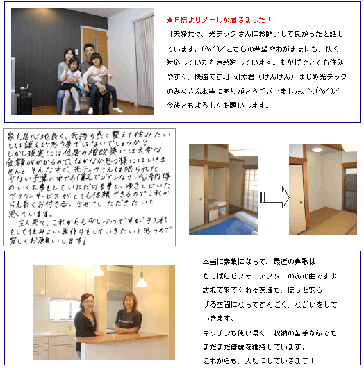 今後は他もリフォームしなければならないので光テックさんに全てお願いしようと考えております。良いご縁ありがとうございました!