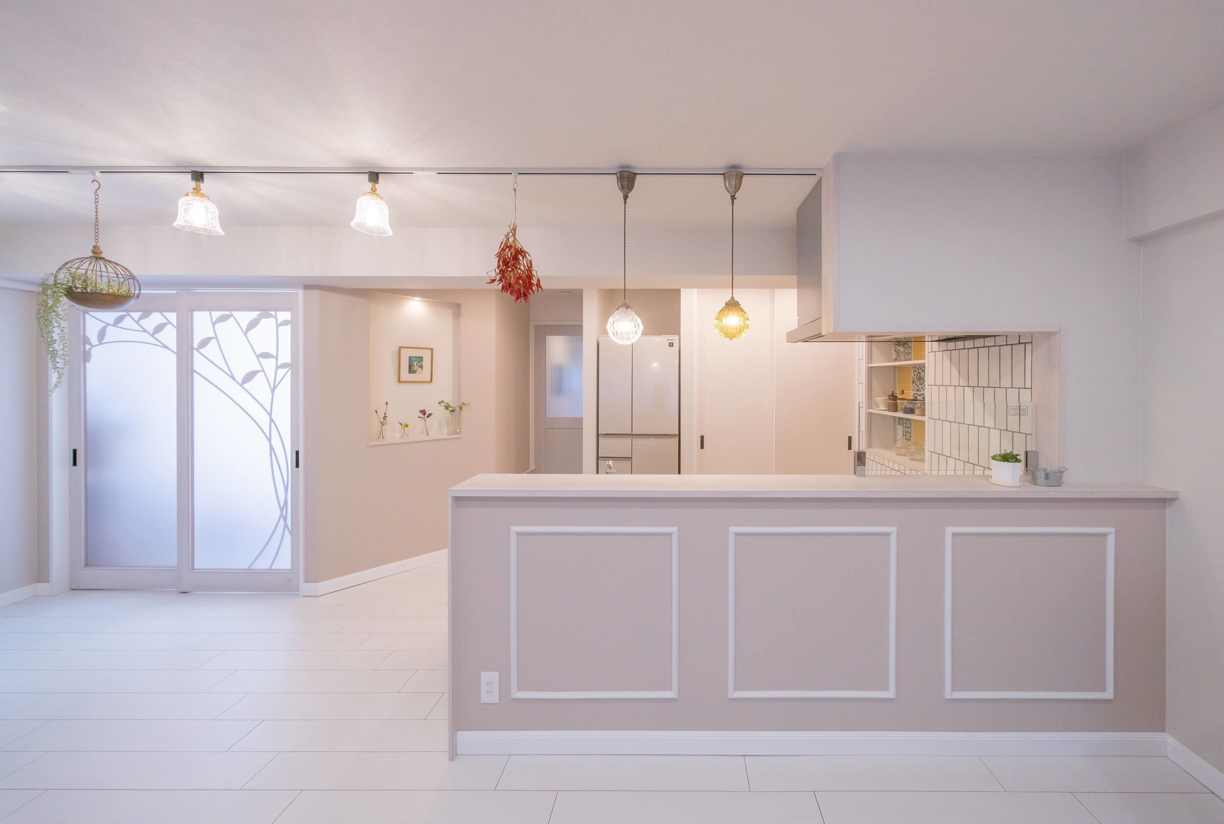 キッチンを中心にくるくると回れる動線が最高です!照明やタイルも可愛くてワクワクします。