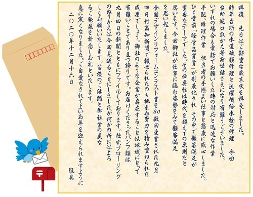 拝復 先日はご鄭重な歳末状を拝受しました。昨年台所の水道破損修理と洗濯機給水栓の修理 今回台所蛇口取かえ等お世話さまになり有難うございました。