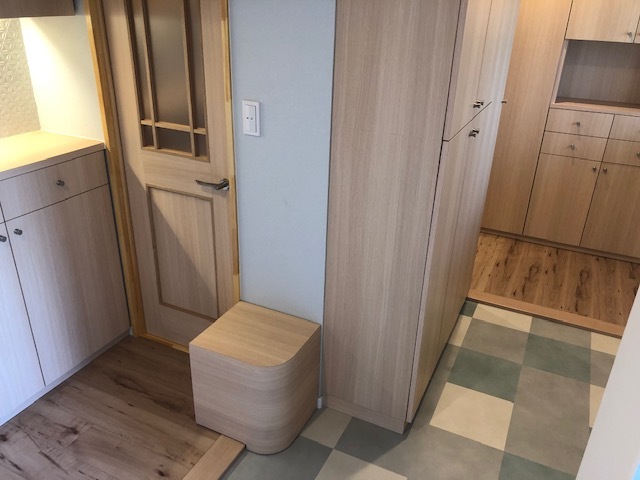 最後に納品されたベンチ兼ランドリーボックスの引手の形がタイルと同じでビックリしました!これが夕部さんのひとさじデザインなんですね♪